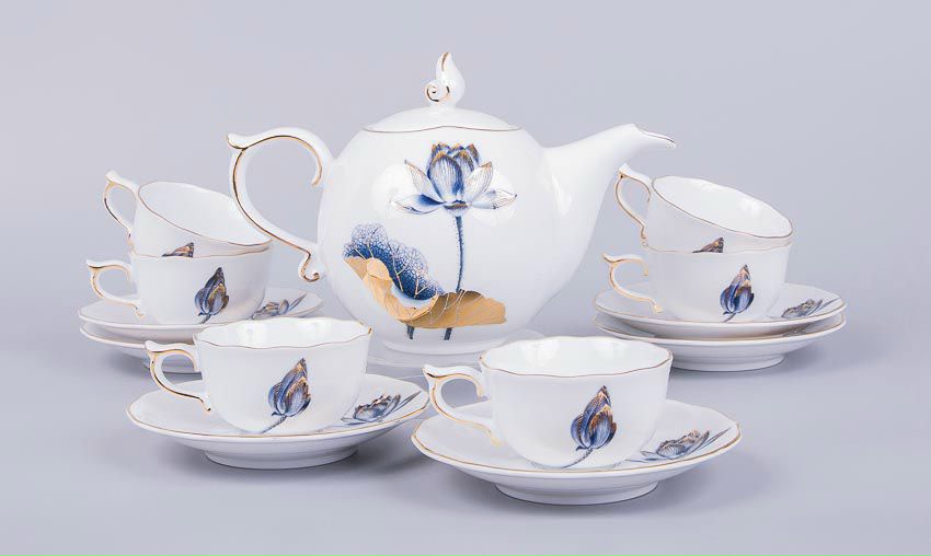Bộ trà 0.7L Mẫu Đơn Tịnh Tâm Vàng: - 01 bình trà 0.7L - 06 tách trà 0.11L - 06 dĩa lót tách 13cm